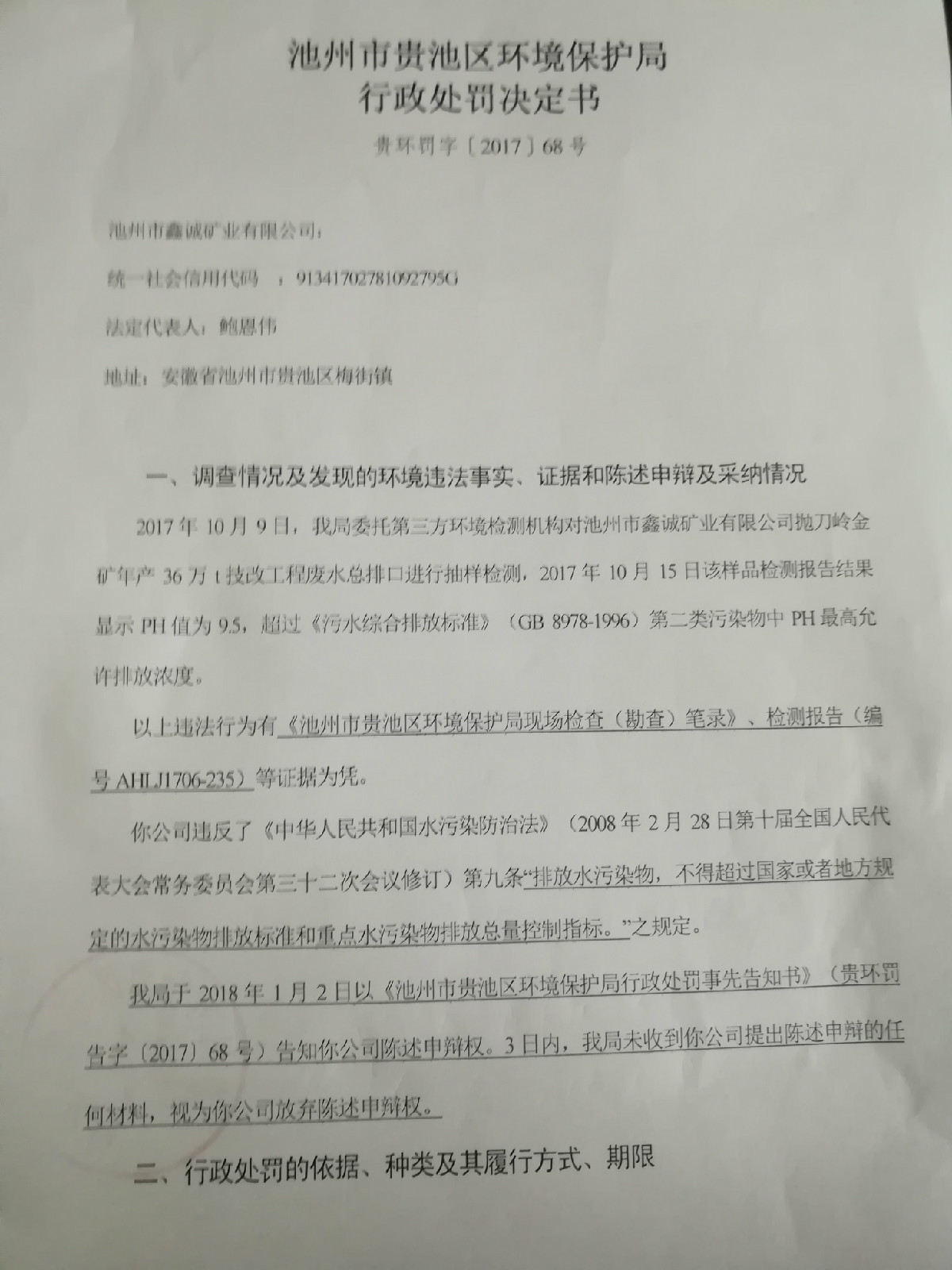 池州市贵池区环境保护局关于池州市鑫诚矿业有限公司行政处罚决定书(贵环罚字[2017]68号)