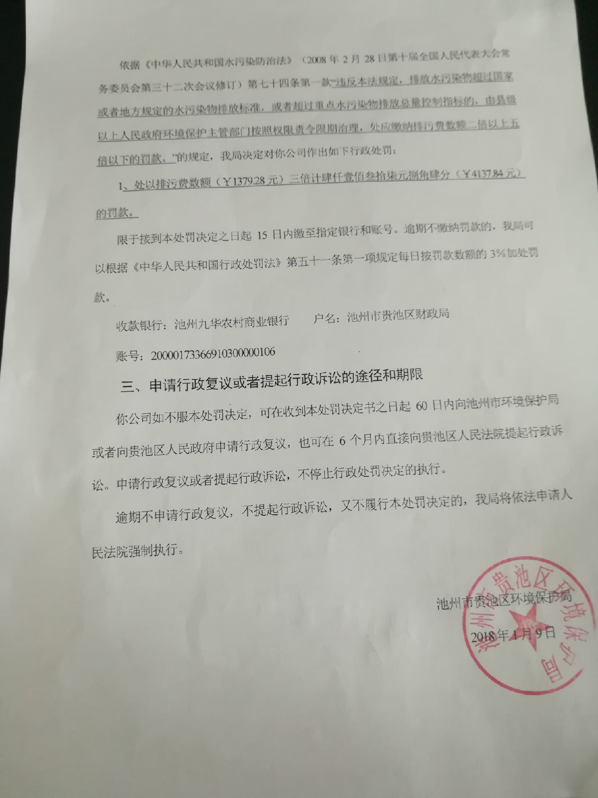 池州市贵池区环境保护局关于池州市鑫诚矿业有限公司行政处罚...